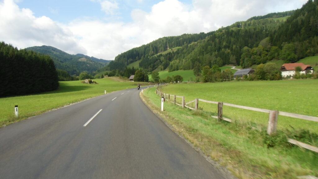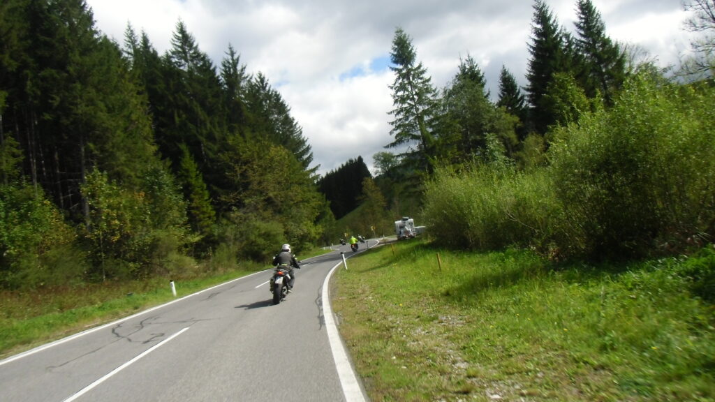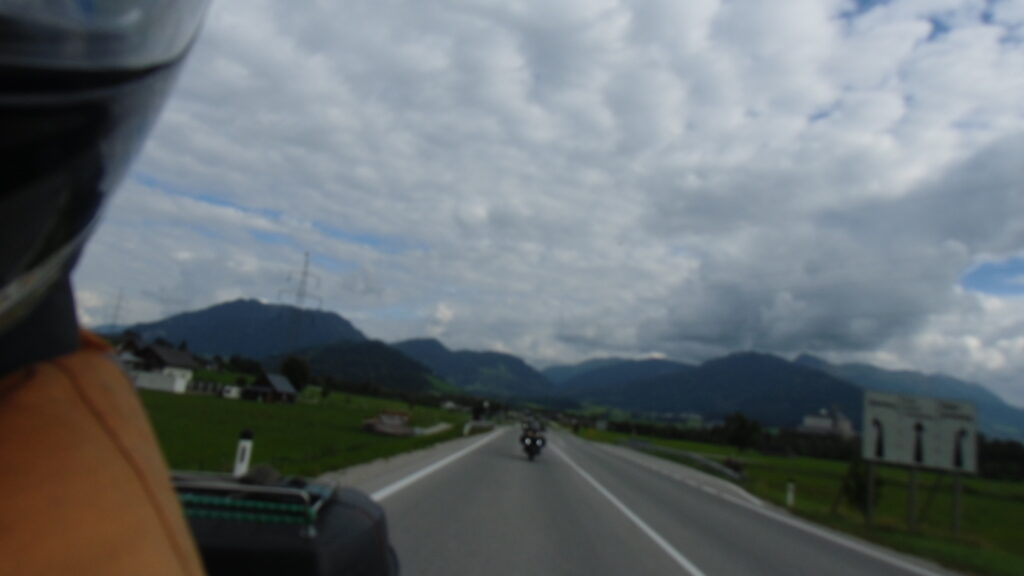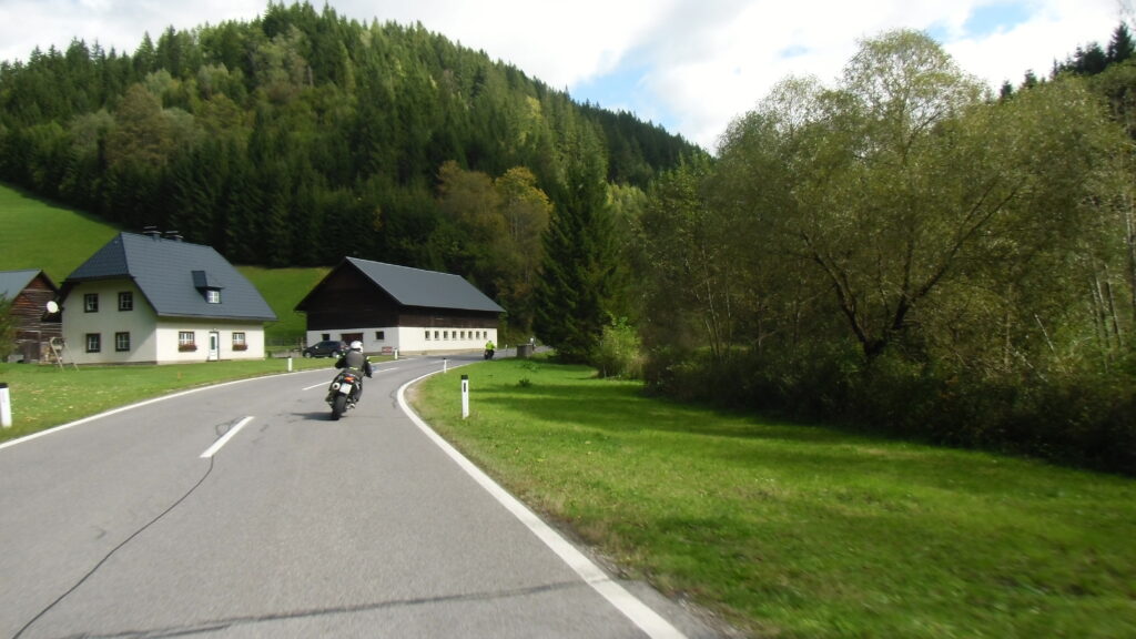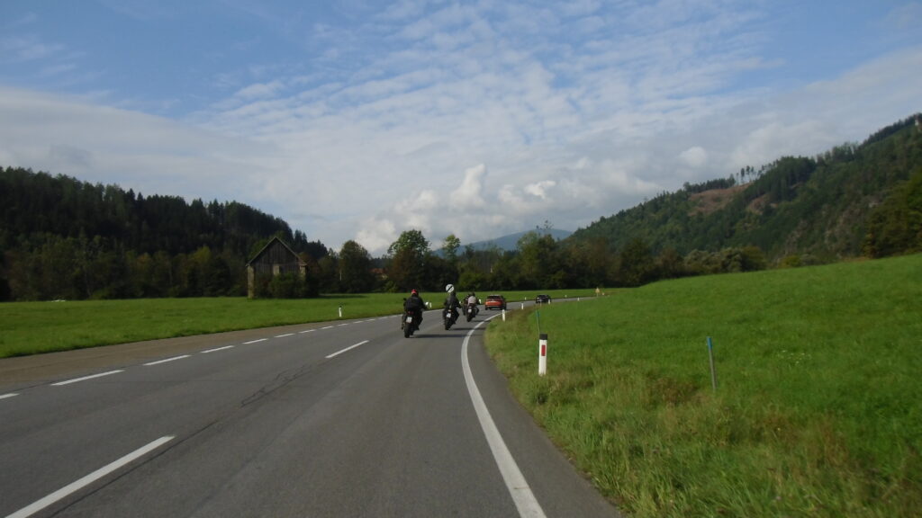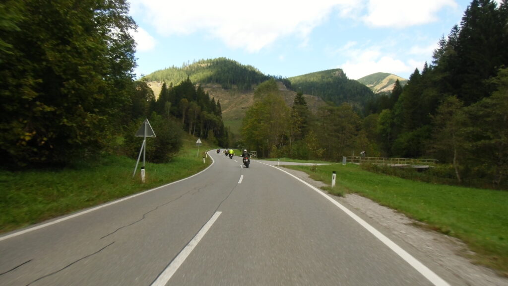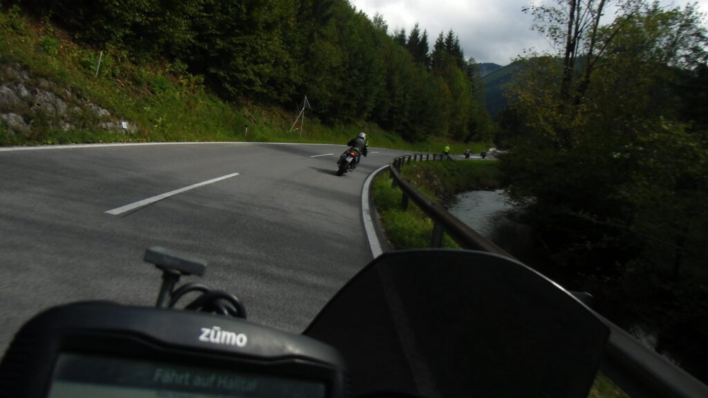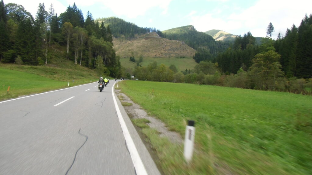 also rüber übern Erzherzog schlaglochpisten pass,.. aber den hams vor paar Jahren an den schlimmsten stellen neu geteert,. .. unten in Stein , rechts anstatt links was das Navy sagt hätt,.. abgebogen und der Alten Enztalstraße folgend Rtg. Liezen, und zuvor links rauf die Schnellstraße über Bag Mitterndorf Rtg. Salzburg…. irgendwo war grad Markt-stau zu bewältigen, …. aber in Fuschl a. See vorm Red Bull Büro rechts, rauf, / rüber nach Thalgau,.. unsagbar Geil de Streck,.. und natürlich dann noch weiter meine Geheimstrecken bis Laufen,.. Waging, Palling , Altenmarkt,. und weils noch nicht glangt die Hausstreckn nach Seebruck zur Kupferschmieden,.. dort noch schnell paar Sonntagsfahrer mein drekerts Moped zeigen und die Nase lang machen..