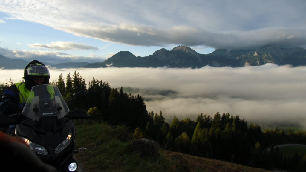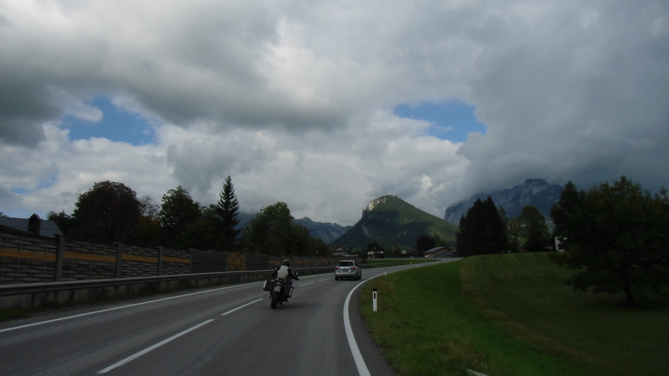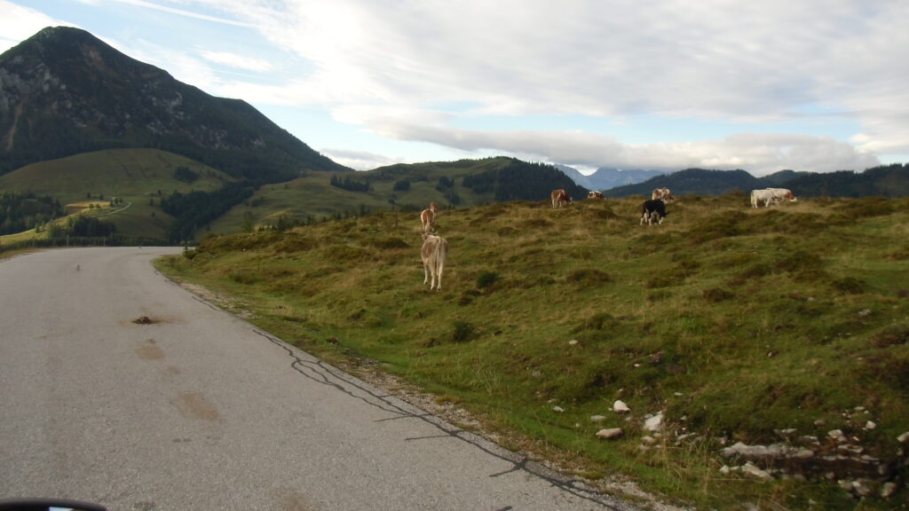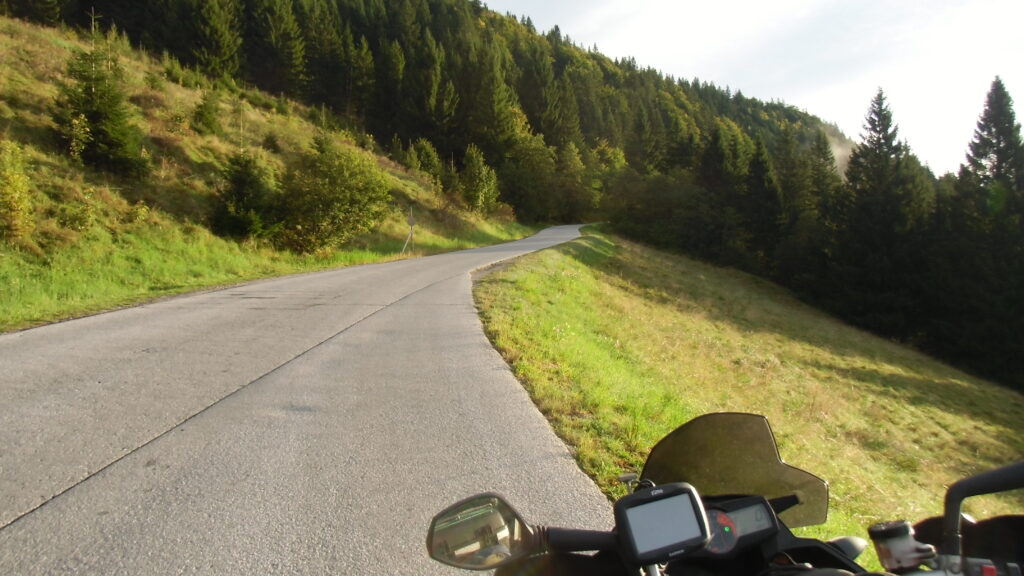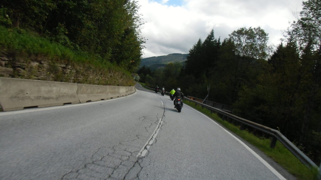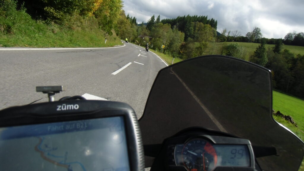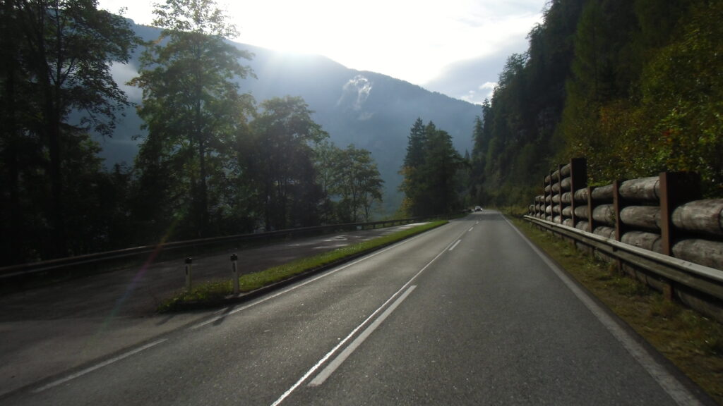 also rüber übern Erzherzog schlaglochpisten pass,.. aber den hams vor paar Jahren an den schlimmsten stellen neu geteert,. .. unten in Stein , rechts anstatt links was das Navy sagt hätt,.. abgebogen und der Alten Enztalstraße folgend Rtg. Liezen, und zuvor links rauf die Schnellstraße über Bag Mitterndorf Rtg. Salzburg…. irgendwo war grad Markt-stau zu bewältigen, …. aber in Fuschl a. See vorm Red Bull Büro rechts, rauf, / rüber nach Thalgau,.. unsagbar Geil de Streck,.. und natürlich dann noch weiter meine Geheimstrecken bis Laufen,.. Waging, Palling , Altenmarkt,. und weils noch nicht glangt die Hausstreckn nach Seebruck zur Kupferschmieden,.. dort noch schnell paar Sonntagsfahrer mein drekerts Moped zeigen und die Nase lang machen..